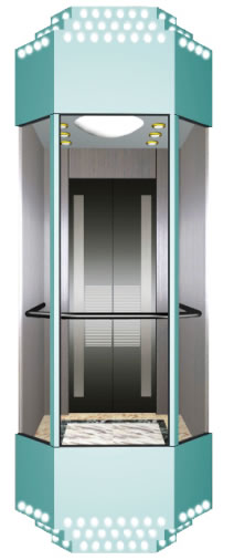 上下罩:阶梯五边形钢板烤漆加装饰灯 观光壁:安全夹胶玻璃 装饰顶:中部圆形亚克力顶灯,两侧筒灯 轿壁:发纹不锈钢 扶手:不锈钢单管 轿底:PVC Car cover:Stepped pentagon st……