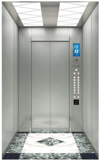 乘客电梯通风:轴流风扇 乘客电梯轿壁:发纹不锈钢 乘客电梯轿门:发纹不锈钢 乘客电梯轿底:PVC地板 Ceiling: Stainless steel mirror framework,acrylic lighting decoration,down lam Ventilation:Axial fan Car wall:Hairline stainless steel Car door:Hairline stainless steel Car bottom:PVC